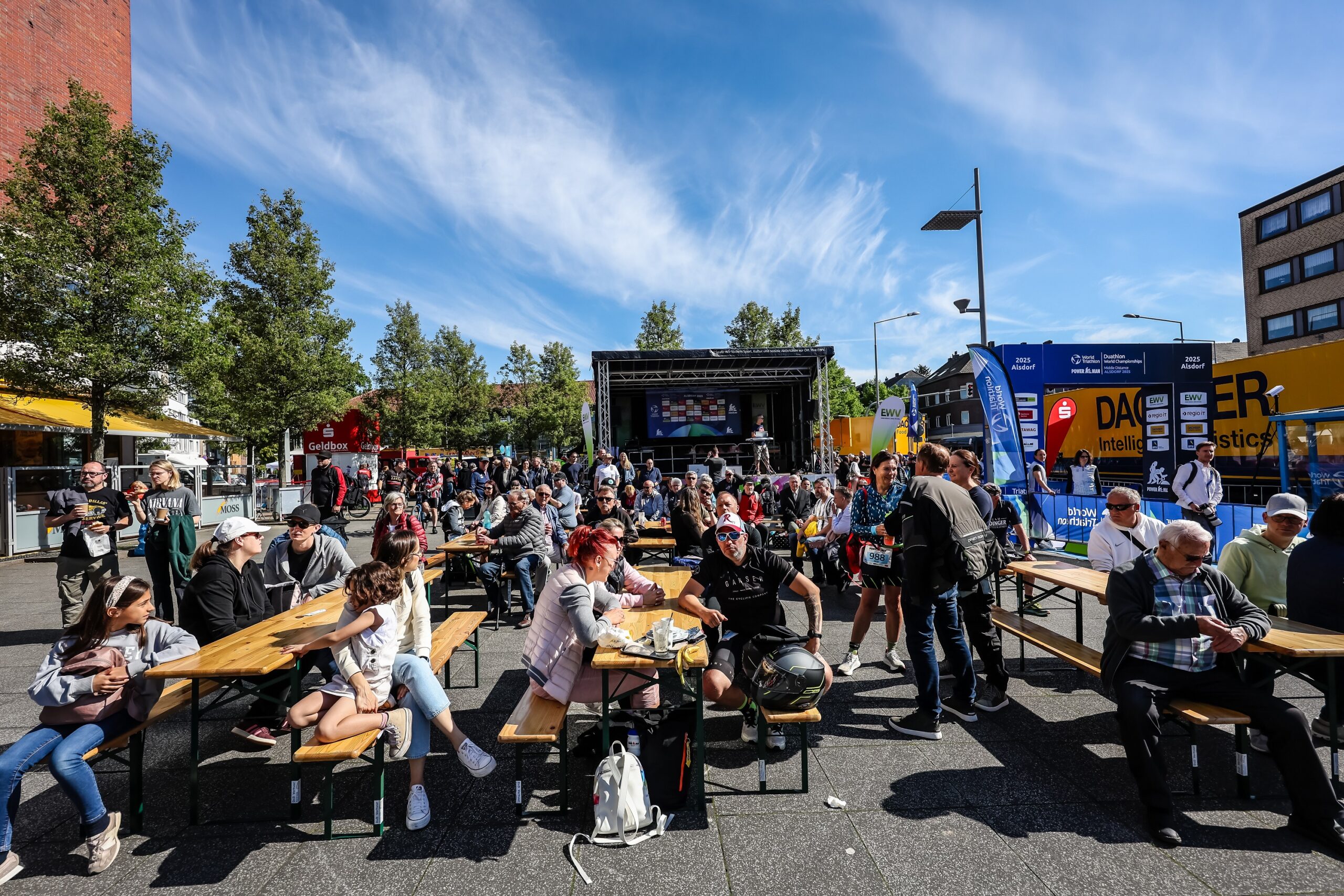 Admission is free along the entire route. Most of the action – including the start, finish, transitions, food truck, commentary, music and seating – takes place around Denkmalplatz. The car park at the Alsdorf Kaufland (Konrad-Adenauer-Allee) and the car park at the Alsdorf Sparkasse (Luisenstraße) offer free parking nearby. We look forward to welcoming every spectator! An international atmosphere, top-class sport up close, all free of charge – it’s well worth a visit!